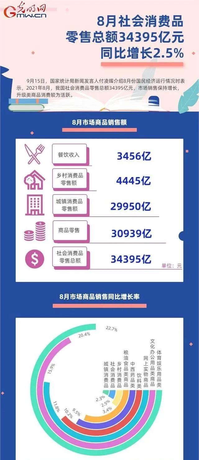 根據國家統計局公布的數據,2021年8月中國社會消費品零售總額34395億元人民幣,同比增長2.5%。其中,餐飲收入8月份同比下降4.5%,商品零售增速和總體零售額增長均有所回落。